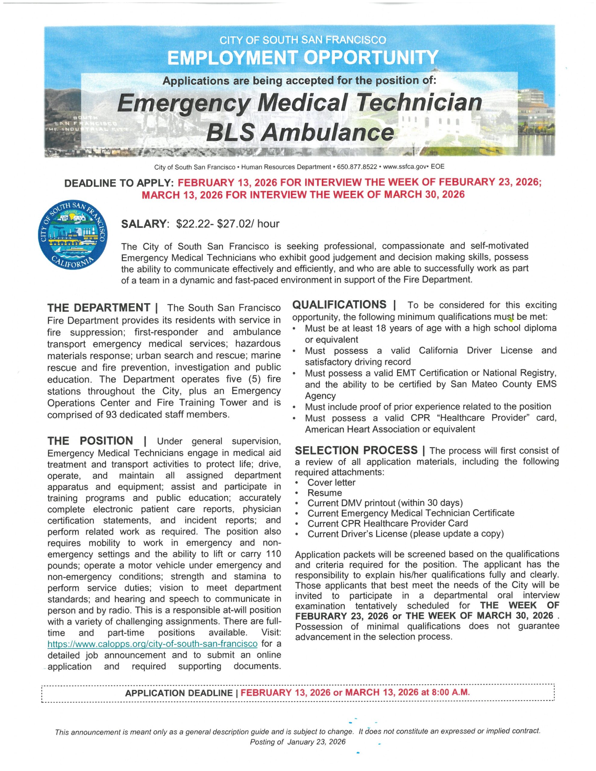 Applications are being accepted for the position of Emergency Medical Technician with the City of South San Francisco. This is a non-benefited, part-time/hourly position.